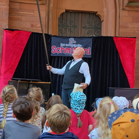 Die Rahmenbedingungen waren bei unserem Fest mit Sicherheit nicht leicht für einen Zauberer. Aussengelände und sehr viele Kinder auf dem Gras-Boden sitzend, die vor Begeisterung immer näher zur Bühne rückten. Ein anderer Zauberer hätte das bestimmt sehr aus dem Konzept gebracht. Herr Schmittini dagegen hat mit seiner pädagogischen Erfahrung eine super Show gemacht und die Kinder beobachten ihn über 60 min begeistert. Eine tolle Bereicherung für jedes Kindergarten - und Schulfest!